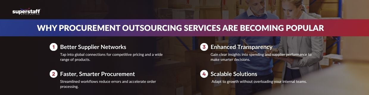 • Better financial oversight: By outsourcing procurement, businesses gain better visibility into their spending patterns. Outsourcing partners track every purchase, helping companies avoid unnecessary costs and spot areas for improvement.