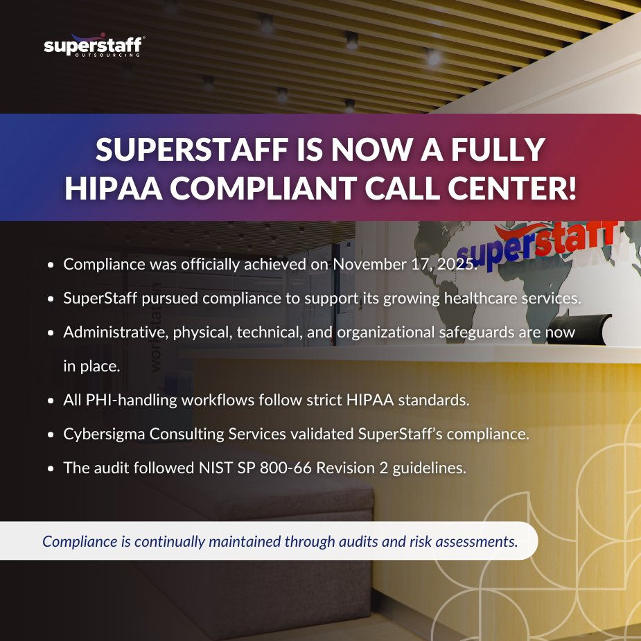 On November 17, 2025, SuperStaff officially achieved full HIPAA compliance, marking a major milestone in our commitment to secure, responsible, and high-quality healthcare outsourcing. This achievement positions us as a stronger, more reliable partner for healthcare organizations that require support across patient communication, authorization coordination, medical billing, healthcare customer service, and other PHI-related functions.