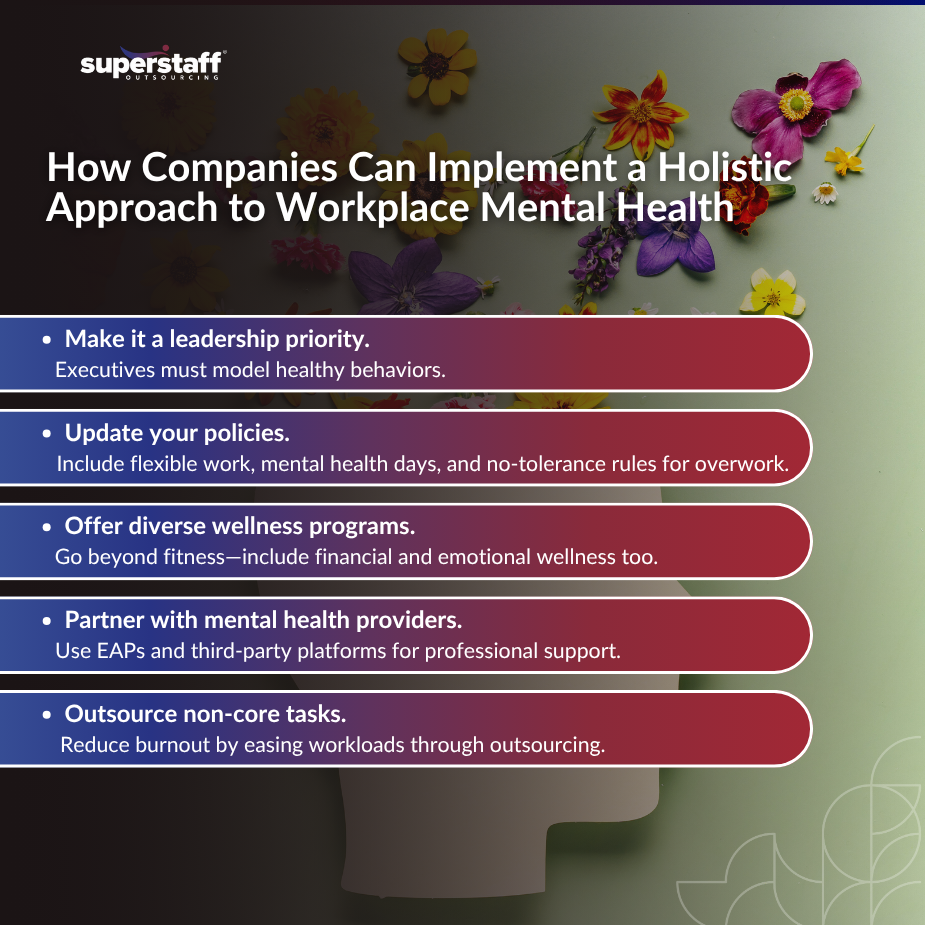 By aligning leadership around workplace mental health, adopting inclusive policies, offering diverse wellness programs, and leveraging outsourcing to scale support, businesses can foster workplaces where people truly thrive.