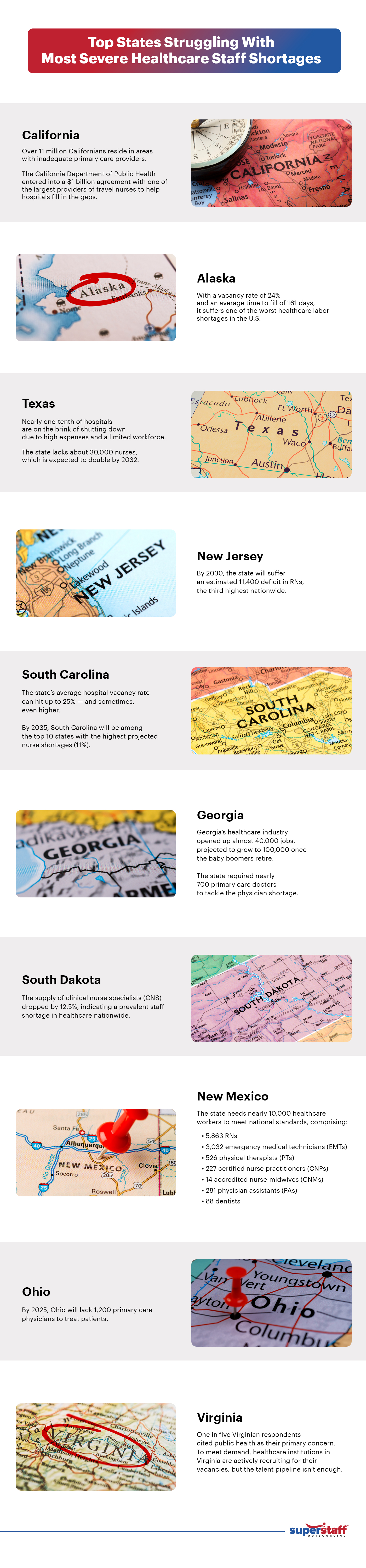With the lingering impacts of the pandemic, aging population, and low wages fuelling South Carolina’s healthcare workforce crisis, the state’s average hospital vacancy rate can hit up to 25% — and sometimes, even higher. By 2035, South Carolina will be among the top 10 states with the highest projected nurse shortages (11%).