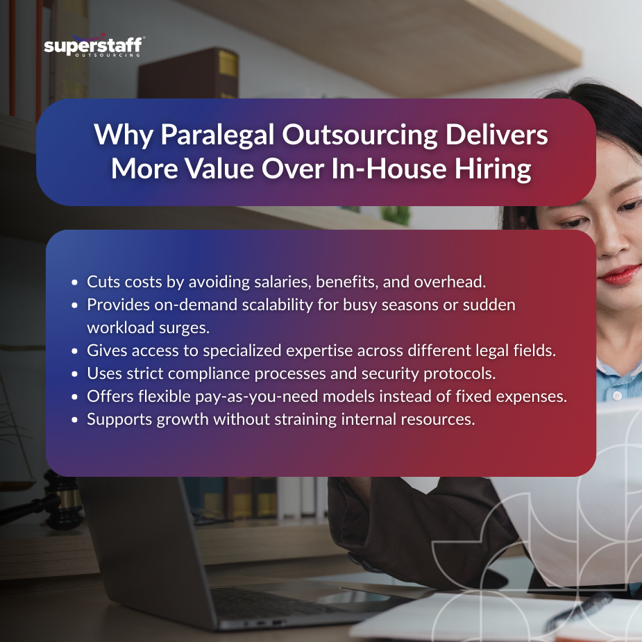 Both in-house hiring and paralegal outsourcing deliver value, but the best choice depends on where a firm stands in its growth journey. In-house teams provide familiarity and control but come with high costs and limited scalability. Outsourcing, on the other hand, offers cost savings, flexibility, and access to specialized expertise, making it an increasingly attractive option for growing firms.