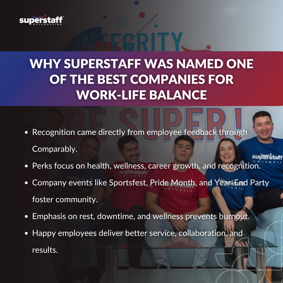 Being named among Comparably’s best companies for work-life balance is not just a badge; it’s proof of SuperStaff’s people-first culture. In an industry often defined by demanding schedules and high-pressure environments, this recognition stands as a clear reminder that the BPO sector can prioritize both productivity and people.